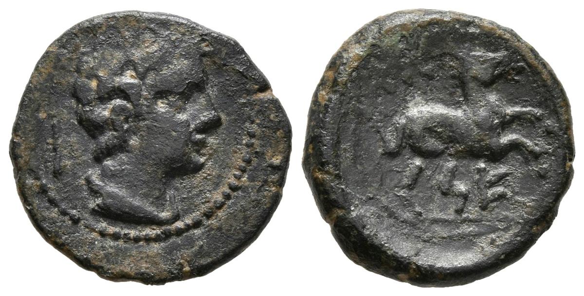 CESE. Cuadrante. 110-20 a.C. Tarragona. A/ Cabeza masculina a derecha, detrás clava. R/ Hipocampo a derecha, encima tres puntos y debajo leyenda CeSE. FAB-2339. Ae. 2,12g. MBC. Escasa.