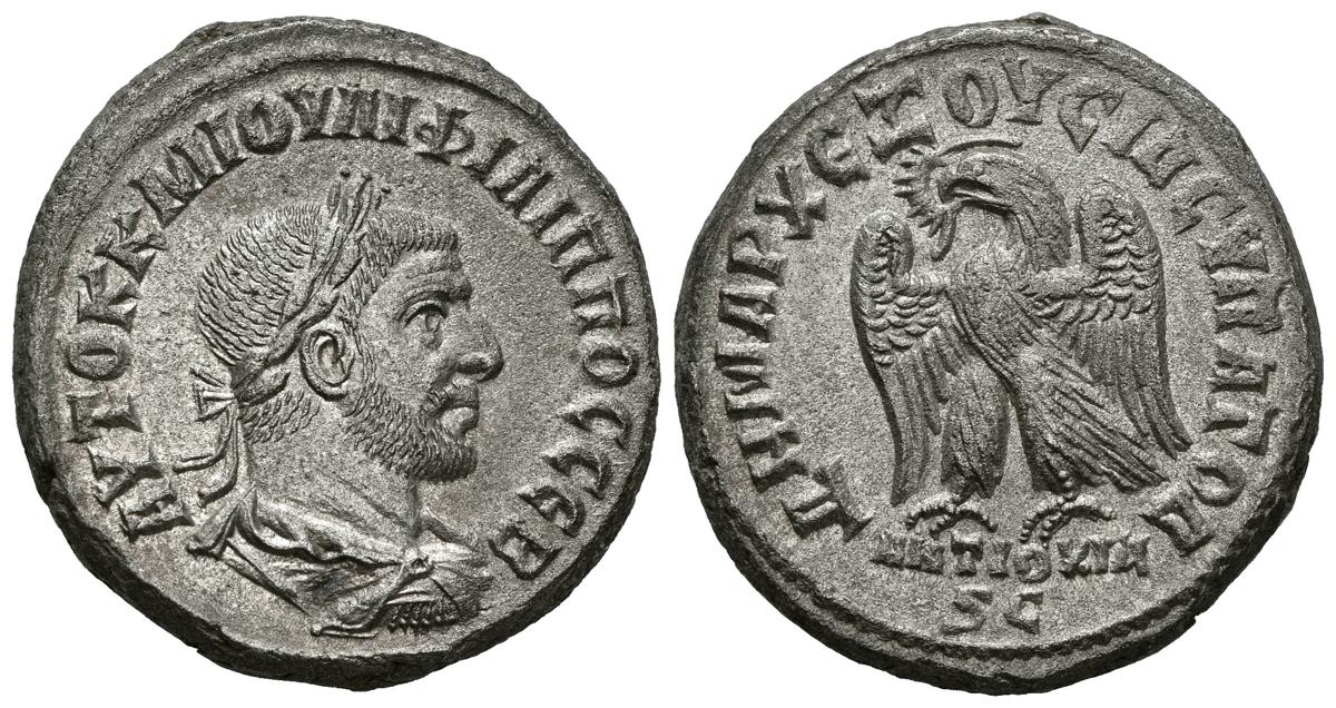 FILIPO I. Tetradracma. (Ve. 12,33g/24mm). 244-249 d.C. Antioquía. (McAlee 935; Prieur 444). EBC. Conserva plateado original.