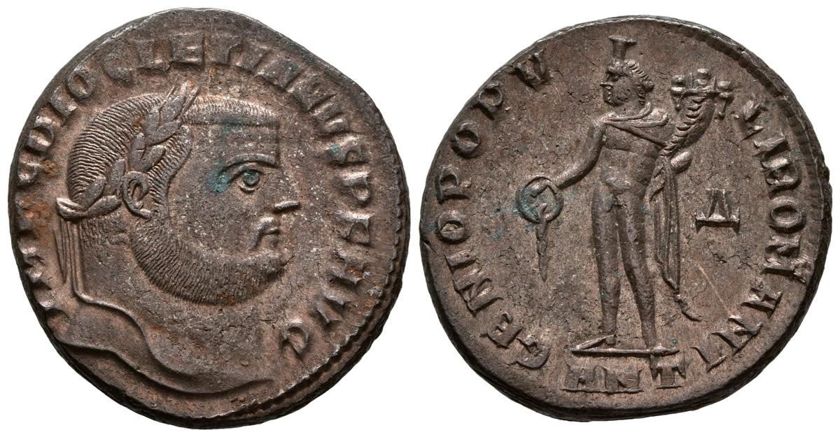 DIOCLECIANO. Follis. 302-303 d.C. Antioquía. A/ Busto laureado a derecha. IMP C DIOCLETIANVS P F AVG. R/ Genio estante a izquierda portando pátera y cornucopia, en el campo izquierdo Delta. GENIO POPVLI ROMANI, en exergo ANT. RIC VI 53. Ae. 10,98g. EBC-. Ex Col. Dattari.
