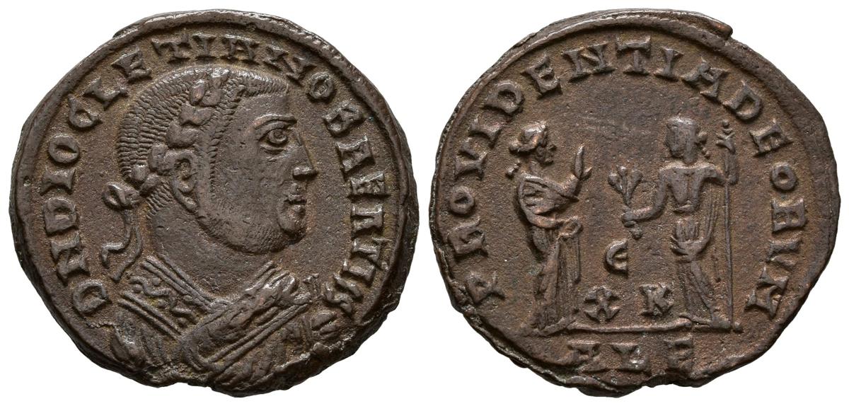 DIOCLECIANO. Follis. 308-310 d.C. Alejandría. A/ Busto laureado y cubierto con manto imperial a derecha, este portando rama de olivo y mappa. D N DIOCLETIANO BAEATISS. R/ Providentia a derecha portando rama y cetro, extendiendo su mano a Quies a izquierda, entre ellas Epsilon-XK. PROVIDENTIA DEORVM, en exergo ALE. RIC VI 109. Ae. 5,97g. MBC+. Escasa. Ex Col. Dattari.