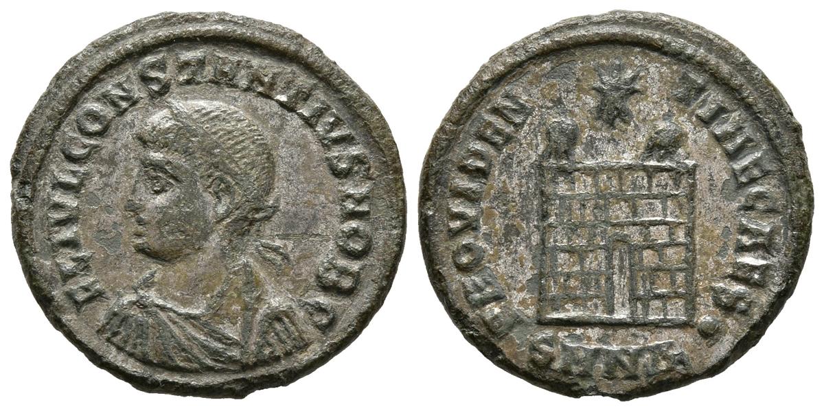 CONSTANCIO II. Follis. (Ae. 3,02g/19mm). 328-329 d.C. Nicomedia. (RIC 158). MBC+. Restos de plateado original.