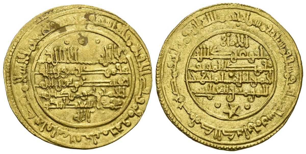 TAIFAS ALMORAVIDES. Muhammad ibn Sad (Ibn Mardanish), a nombre del Imán abasida. Mursiya (Murcia). Dinar. (Au. 3,87g/25mm). 555H. (Vives 1950). EBC. Muy rara, Vives indica la existencia de tres ejemplares. Ex colección Silda.