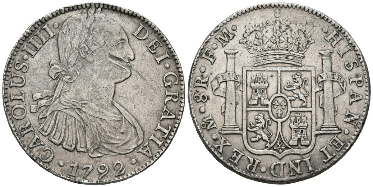 CARLOS IV. 8 Reales. (Ar. 26,84g/38mm). 1792. México FM. (Cal-685). MBC+. Golpe en anverso y en canto, acuñación desplazada.