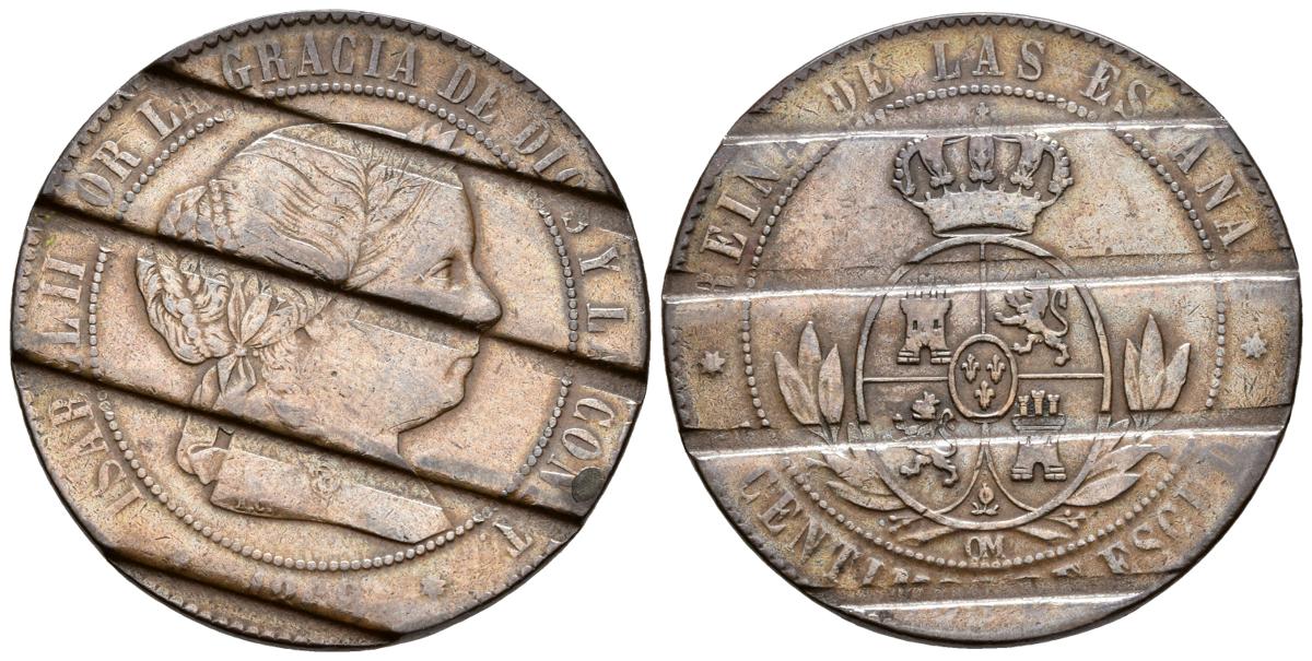 ISABEL II (1833-1868). 5 Céntimos de escudo. (Ae. 12.21g/32.4mm). 1868. Barcelona. Desmonetizada. Cal-655. MBC.