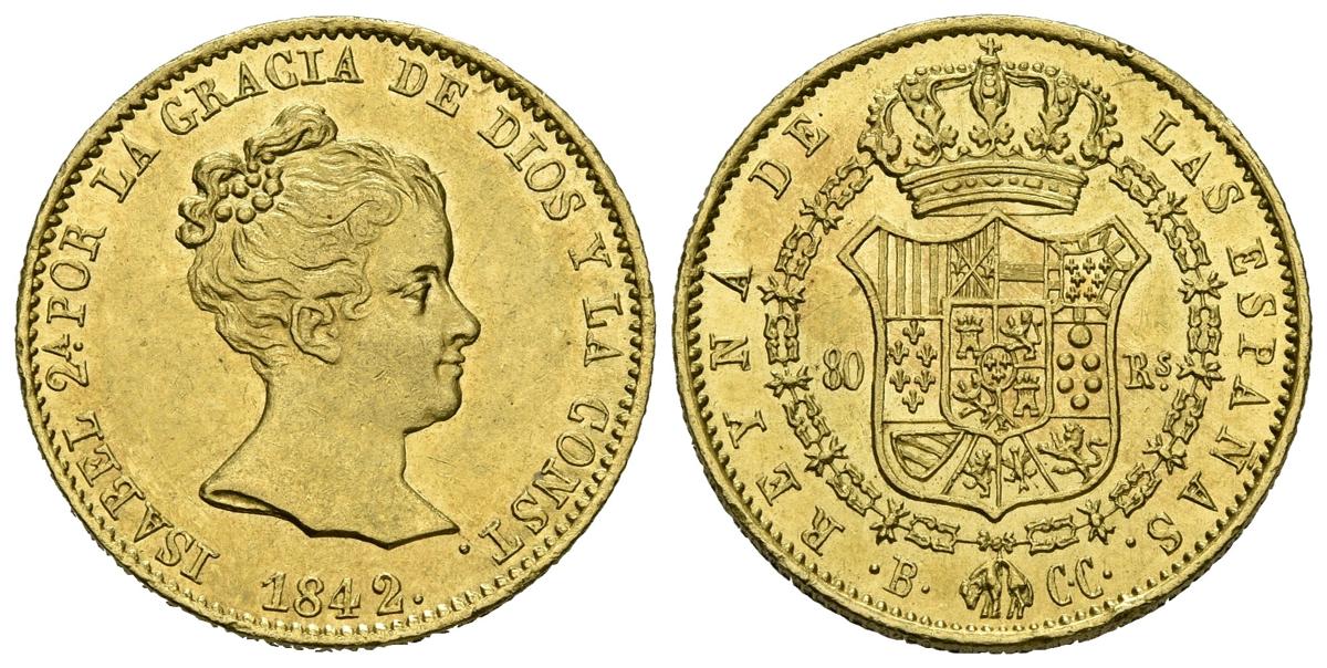 ISABEL II (1833-1868). 80 Reales. (Au. 6,76g/21mm). 1842. Barcelona CC. (Cal-709). MBC+.