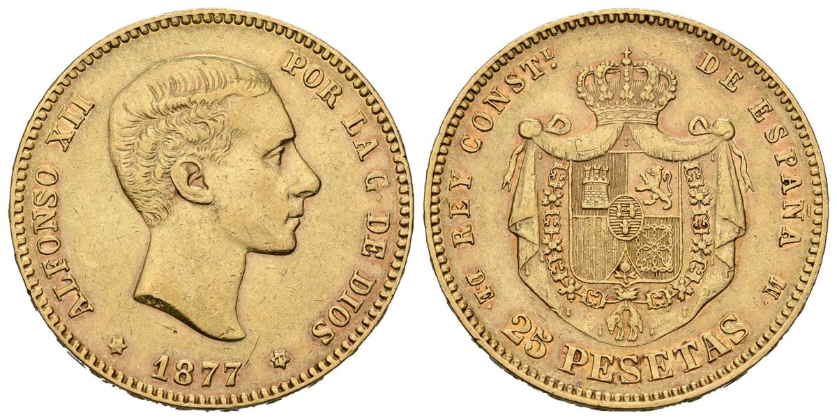 ALFONSO XII (1814-1885) .25 Pesetas (Au. 8,04g/24mm). 1877 (*18*77). Madrid. (Cal-2019-68).EBC-. Pequeñas marquitas. Primera estrella no visible.