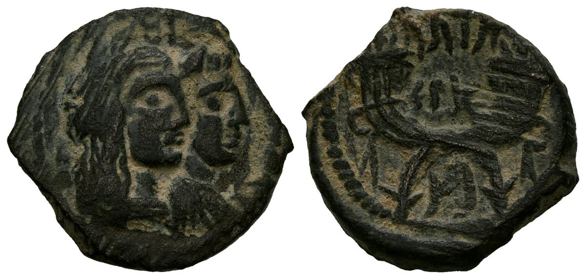 REINO NABATEO, Aretas IV con Shaquilat. Ae19. (Ae. 4,47g/19mm). Petra. 9 a.C.-40 d.C. (Meshorer, Nabataea 114 var). Variante de monograma en reverso. EBC+. Escasa así.