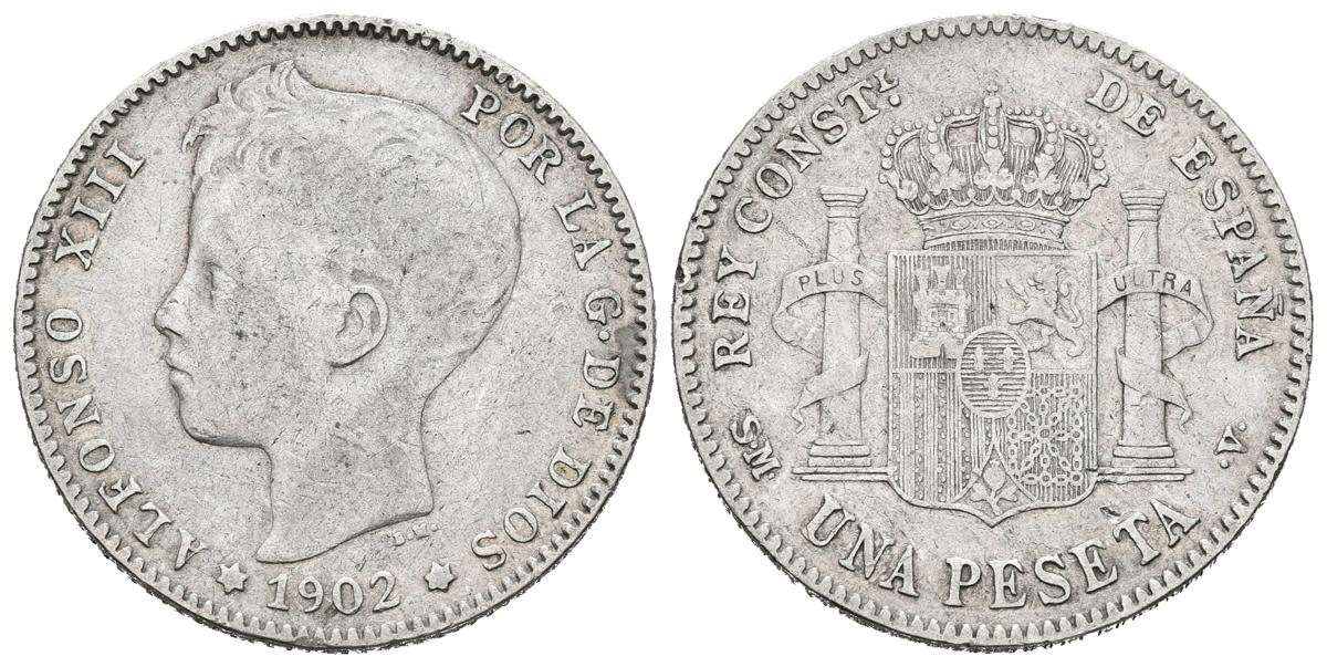 ALFONSO XIII (1885-1931). 1 Peseta (Ar. 4,94g/23mm). 1902 (estrellas no visibles). Madrid. (Cal-64). MBC/MBC+.
