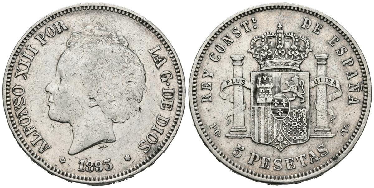 ALFONSO XIII. 5 Pesetas. (Ar. 24,88g/37mm). 1893 *18-93. Madrid PGV. (Cal-103). MBC-. Escasa.