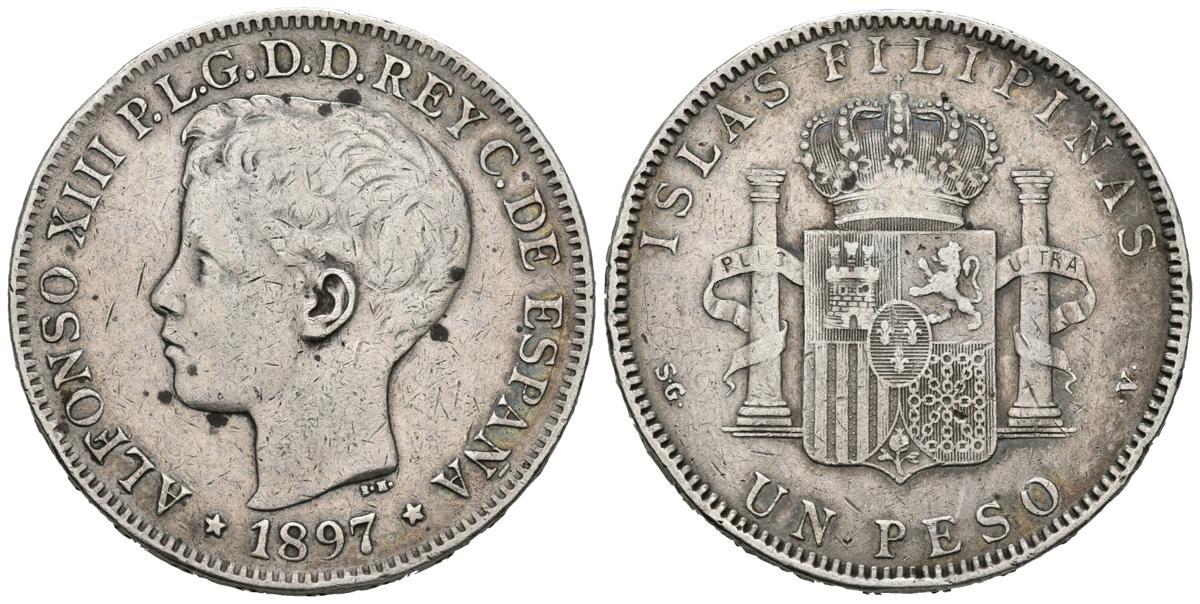 ALFONSO XIII. 1 Peso. 1897. Manila SGV. Cal-81. Ar. 24,73g. Manchitas en anverso. MBC-.