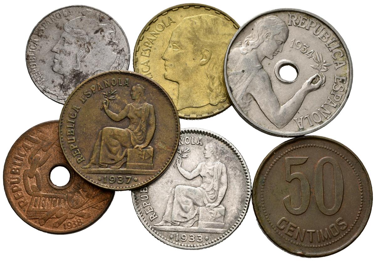 II REPUBLICA. Lote de 7 monedas de diferentes valores (5, 25, 50 céntimos y 1 peseta), materiales y años de acuñación (1933, 1934 1937 y 1938). Diferentes calidades. A EXAMINAR.