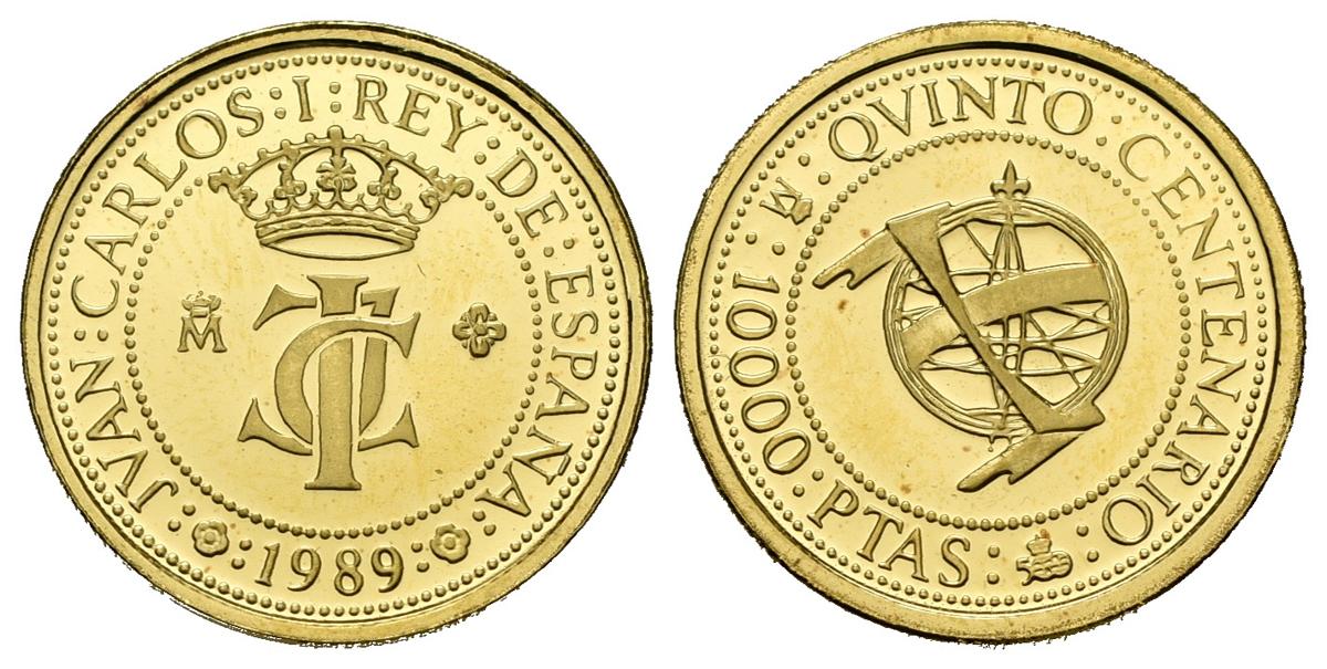 JUAN CARLOS I (1975-2014). 10.000 Pesetas. (Au. 3,37g/19mm). 1989. Madrid. Moneda conmemorativa del Quinto Centenario. Incluye cápsula, estuche de madera y certificado de auntenticidad de la FNMT. Tirada de sólo 17000 piezas. Flor de cuño.