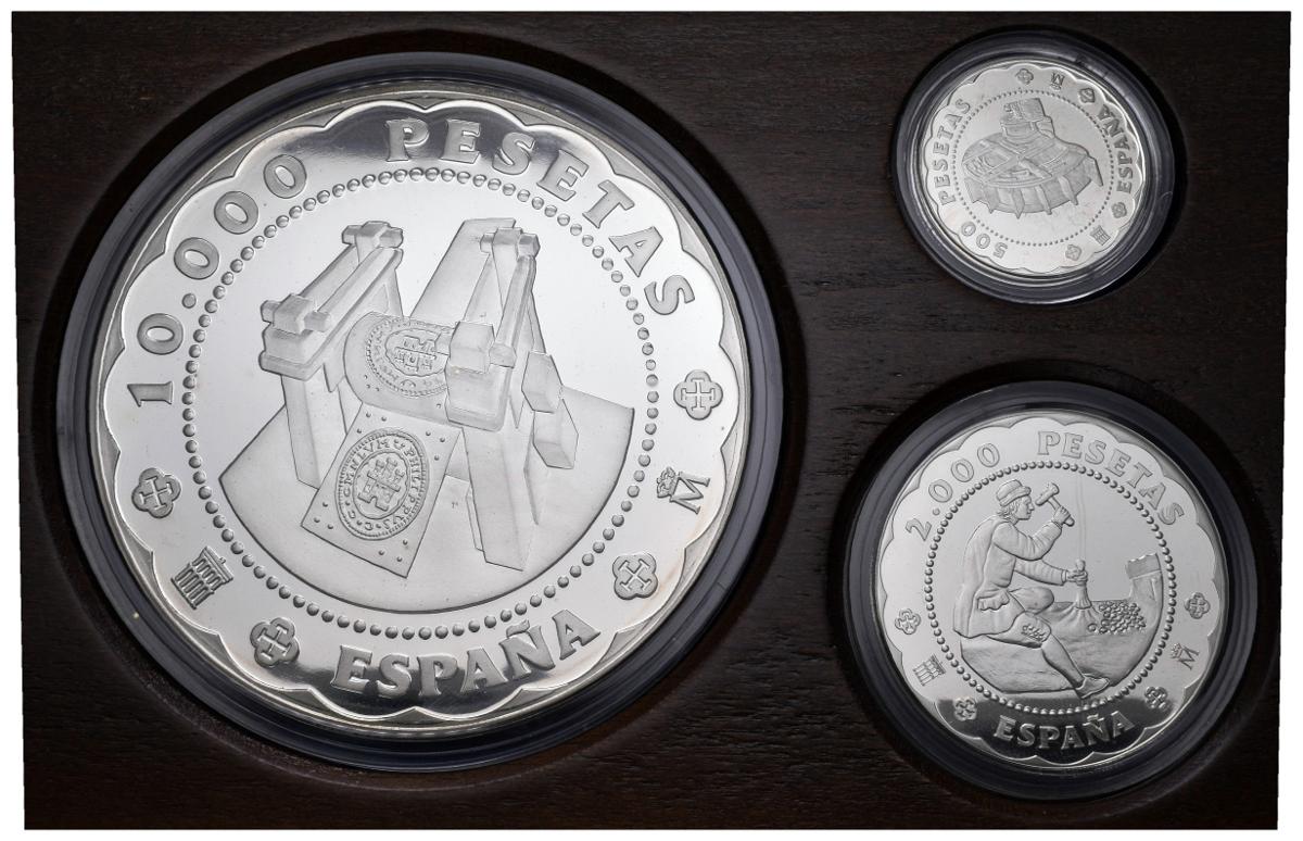 JUAN CARLOS I. Serie completa a falta de la pieza de oro con los valores: 10000, 2000 y 500 Pesetas. 2001. "CASA DE LA MONEDA DE SEGOVIA". PROOF. Presetanda en estuche oficial.
