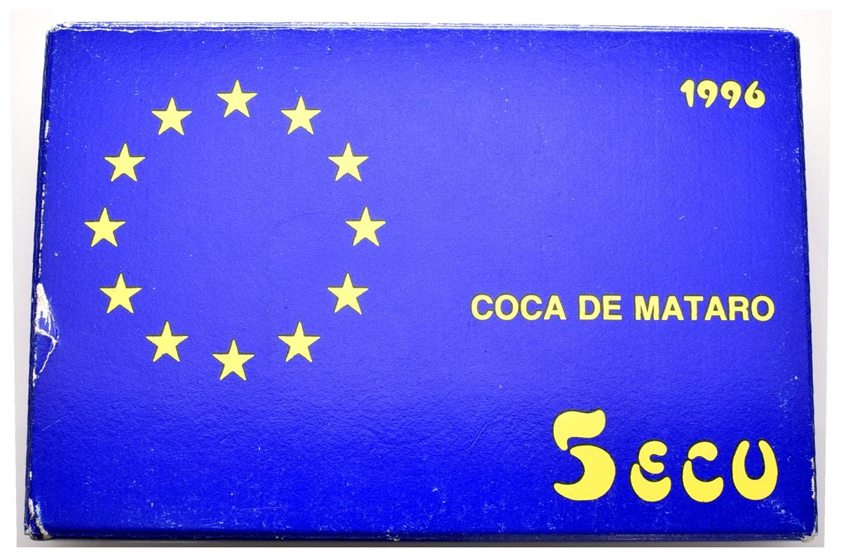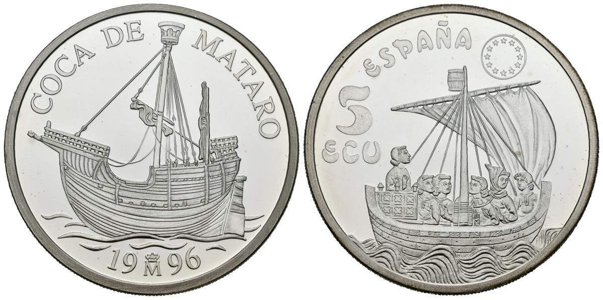JUAN CARLOS I. 5 Ecu. (Ar. 33,62g/42mm). 1996. "COCA DE MATARO". PROOF. Presentada en estuche oficial con certificado.