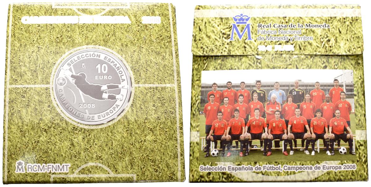 JUAN CARLOS I. 10 Euros. (Ar. 27,00g/40mm). 2008. "SELECCION ESPAÑOLA DE FUTBOL, CAMPEONA DE EUROPA 2008". PROOF. Presentada en estuche oficial con certificado.
