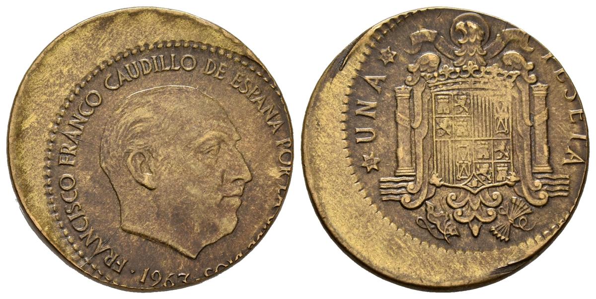 ESTADO ESPAÑOL. 1 Peseta (Cu. 3,56g/21mm). 1963 (*19-65). Madrid. (Cal-2019-65). MBC. Acuñación desplazada 4mm.