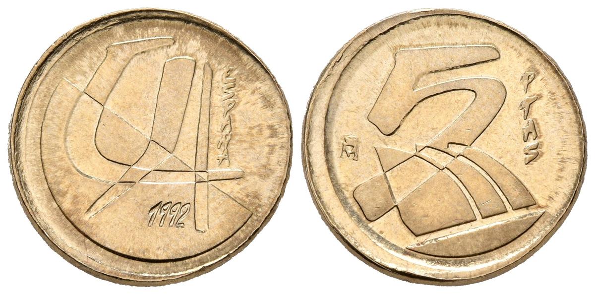 JUAN CARLOS I. 5 Pesetas. (2,95g/19mm). 1992. Madrid. (Cal-51 var). Variante: Acuñación desplazada y mayor diámetro. SC.