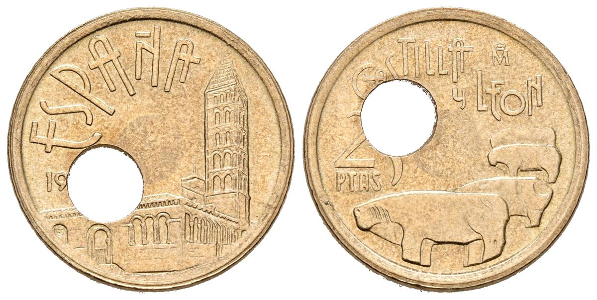 JUAN CARLOS I. 25 Pesetas. (4,23g/20mm). 1995. Madrid. (Cal-92 var). Variante: Perforación central muy desplazada. SC. Muy rara.