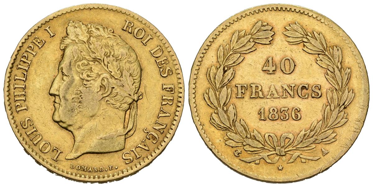 FRANCIA. 40 Francos. (Au. 12,83g/26mm). 1836. París A. (Km#747.1). MBC-.