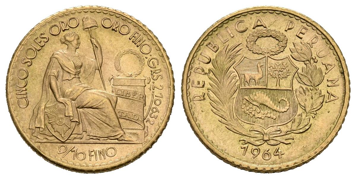 PERU. 5 Soles. (Au. 2,34g/15mm). 1964. (Km#235). SC.