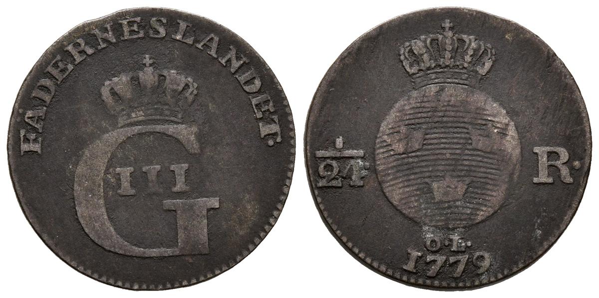 Suecia. 1/24 Riksdaler.(Ar. 2,72/20mm). 1779. (Km#522). Gustaf III. MBC. Pátina oscura.
