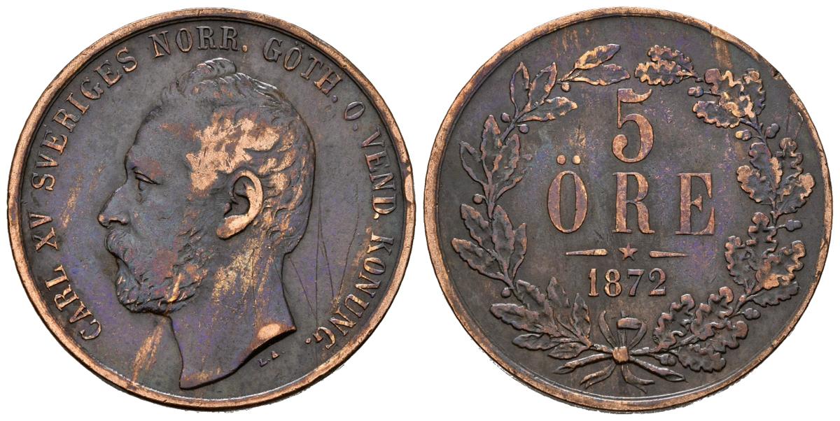SUECIA. 5 Ore. (Ae. 8,72g/29mm). 1872. (Km#707). MBC.