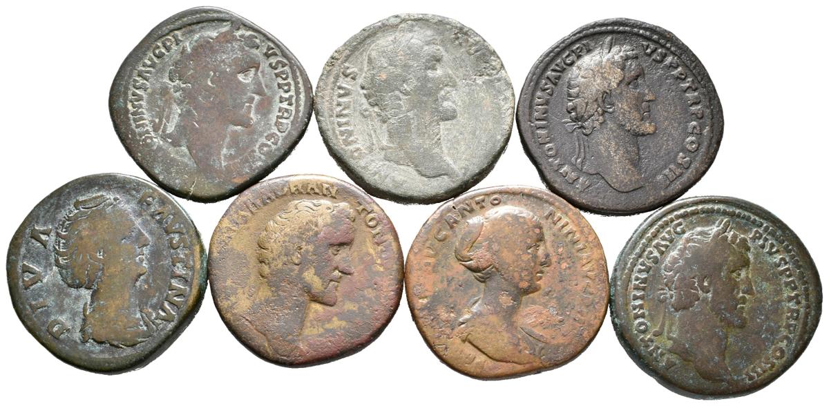 IMPERIO ROMANO. Lote compuesto por 7 Sestercios de Antonino Pio, Diva Faustina y Faustina II, todos con reversos diferentes. Ae. A EXAMINAR.