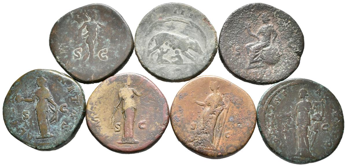 IMPERIO ROMANO. Lote compuesto por 7 Sestercios de Antonino Pio, Diva Faustina y Faustina II, todos con reversos diferentes. Ae. A EXAMINAR.