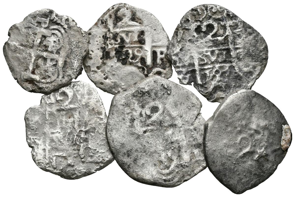 MONARQUIA ESPAÑOLA. Lote compuesto por 6 monedas de plata macuquinas de Felipe V: 4 Reales y 2 Reales 172?, 1726, 1728, 1735 y 1738. Oxidaciones. A examinar.