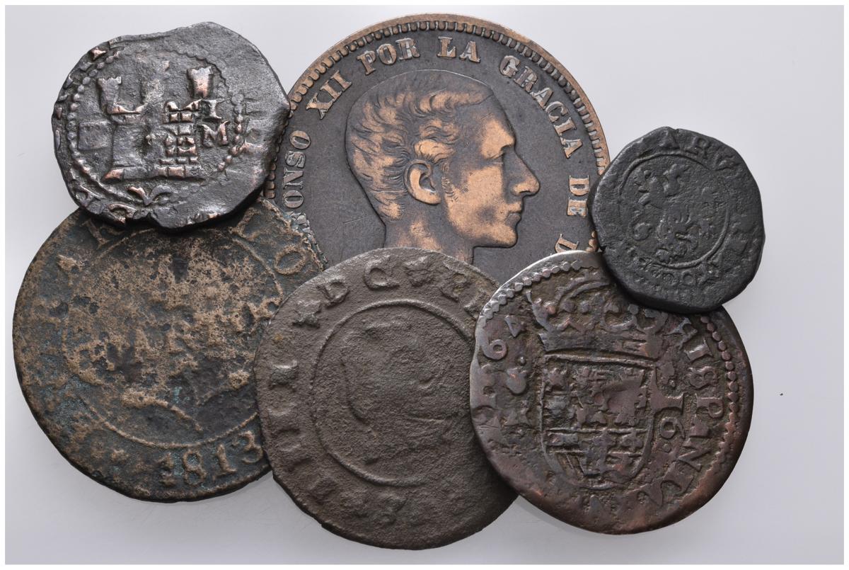MONARQUIA ESPAÑOLA. Lote de 6 cobres españoles de diferentes épocas y valores. Incluye 16 maravedís de 1663 de Granada y 2 Maravedís de la ceca de Cuenca. Diferentes estados de conservación. A EXAMINAR.