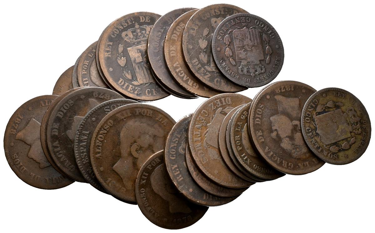 CENTENARIO DE LA PESETA. Lote compuesto por 27 monedas de cobre de 10 y 5 céntimos de Alfonso XII de la ceca de Barcelona. Todos los años acuñados de estas series representados. Diferentes estados de conservación. A EXAMINAR.