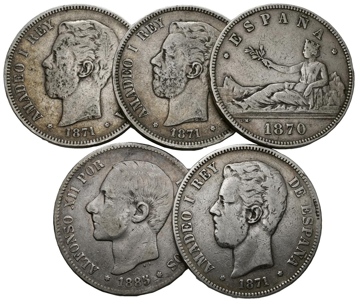 Conjunto de 5 monedas de 5 Pesetas del Centenario de la Peseta. Incluye 3 piezas de Amadeo I y 1 del Gobierno Provisional y del Reinado de Alfonso XII. Diferentes estados de conservación. A examinar.