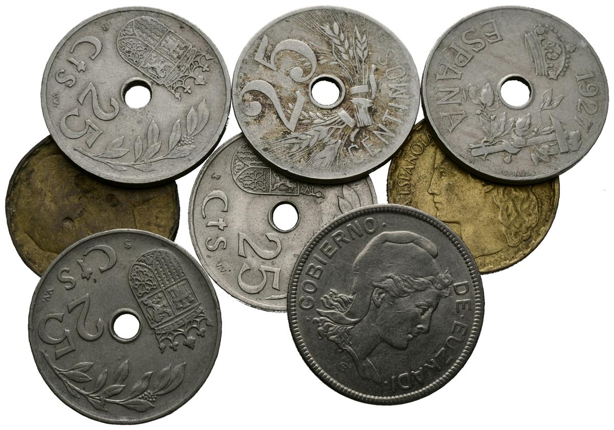 CENTENARIO DE LA PESETA y GUERRA CIVIL. Conjunto de 8 monedas comprendidas entre el reinado de Alfonso XIII y la Guerra Civil. Diferentes materiales, valores así como estados de conservación. A EXAMINAR.