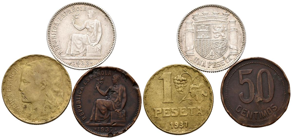 II REPUBLICA. Lote de 3 monedas de la II República española. Diferentes valores, materiales, incluyendo plata, así como estados de conservación. A EXAMINAR.