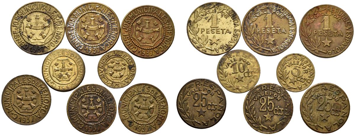 GUERRA CIVIL. Lote de 8 monedas de Menorca de la época de la II República. Diferentes módulos, valores y estados de conservación. A EXAMINAR.