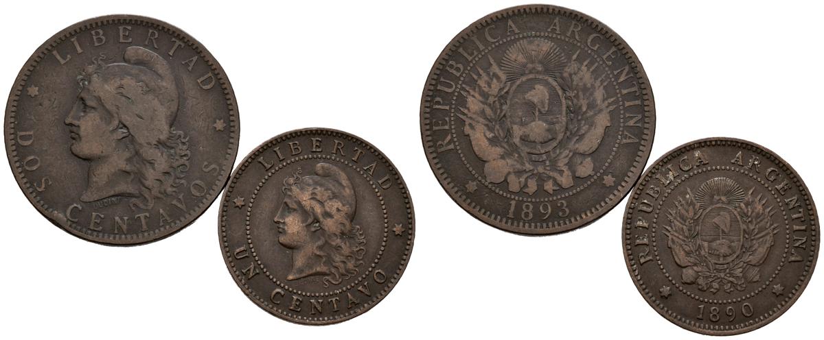 Conjunto de 2 monedas de 1 y 2 centavos argentinos de 1890 y 1893. Diferentes estados de conservación. A examinar.