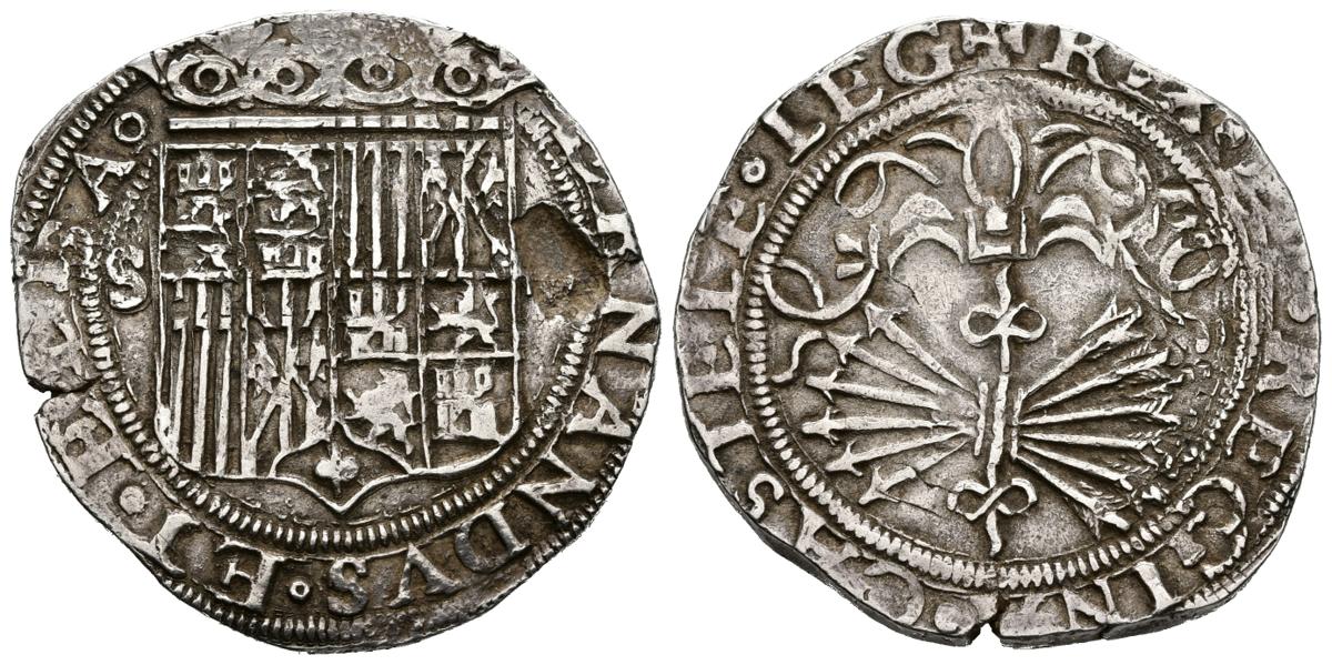 REYES CATÓLICOS (1474-1504). 4 Reales. (Ar.13,54g/34mm). Sevilla. (Cal-2019-560). Sin marcas en reverso. MBC+. Hoja grande en anverso.