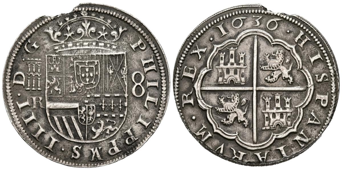 FELIPE IV (1621-1665). 8 Reales. (Ar. 26,20g/40mm). 1636. Segovia R. (Cal-2019-1611). Variante: PHILIPPAVS. MBC+. Rotura de cospel.