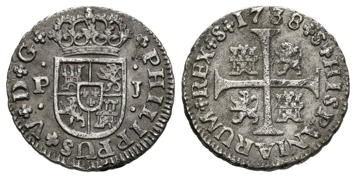 FELIPE V (1700-1746). 1/2 Real (Ar. 1,35g/14,5mm). 1738. Sevilla (Cal-2019-345). MBC+. Oxidaciones limpiadas.