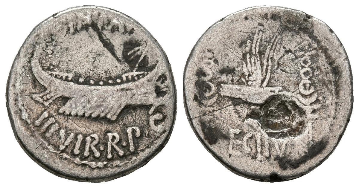 MARCO ANTONIO. Denario. (Ar. 3,01g/17mm). 32-31 a.C. Ceca volante. (Crawford 544/17; FFC 35). MBC-. Contramarca en reverso.