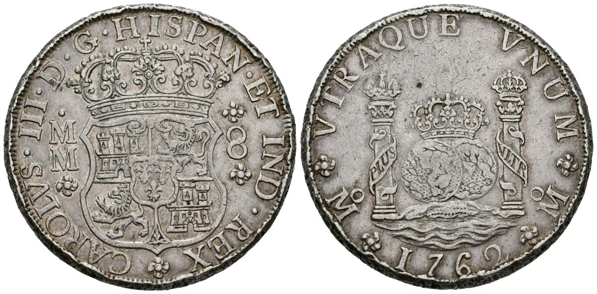 CARLOS III (1759-1788). 8 Reales. (Ar. 26,80g/39mm). 1762. México MM. (Cal-2019-1080). Variante: Cruz entre H e I. EBC-. Golpes en el canto.