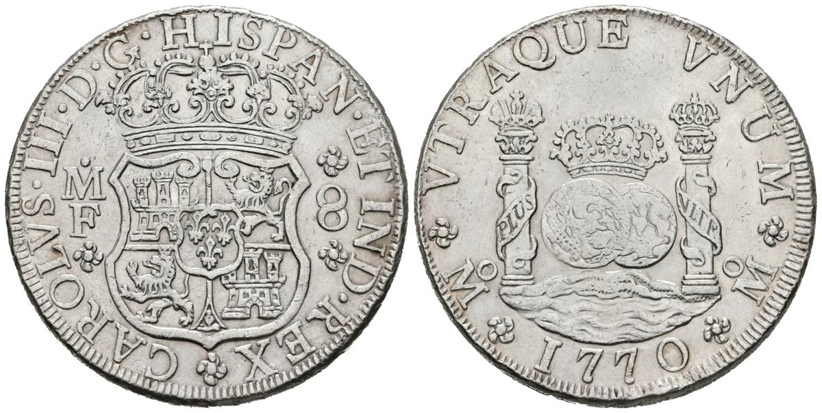 CARLOS III (1759-1788). 8 Reales. (Ar. 26,89g/40mm). 1770. México MF. (Cal-2019-1099). MBC+. Canto redondeado.
