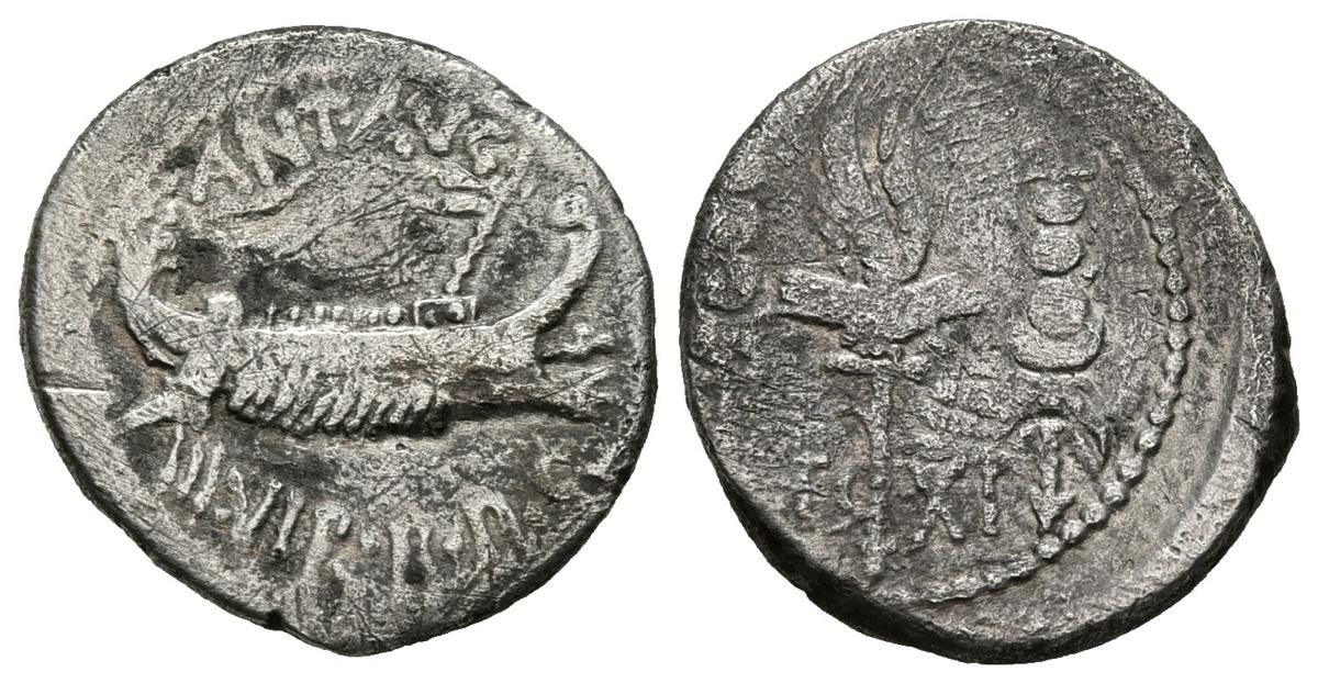MARCO ANTONIO. Denario. (Ar. 3,15g/18mm). 32-31 a.C. Ceca volante. (Crawford 544/25; FFC 44). MBC/MBC-. Rayas en anverso y reverso.