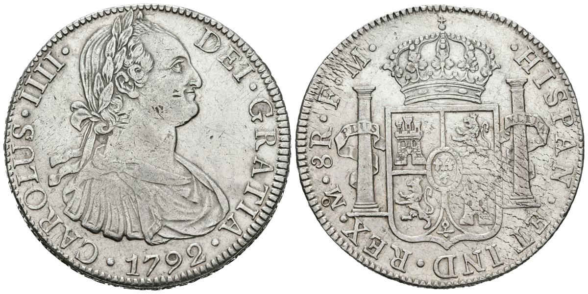 CARLOS IV (1788-1808). 8 Reales. (Ar. 26,89g/39mm). 1792. México FM. (Cal-2019-954). MBC+. Plata agria.