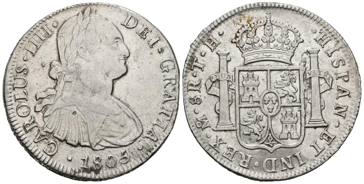 CARLOS IV (1788-1808). 8 Reales. (Ar. 26,91g/40mm). 1805. México TH. (Cal-2019-983). EBC-. Pequeño resto de plata agria.