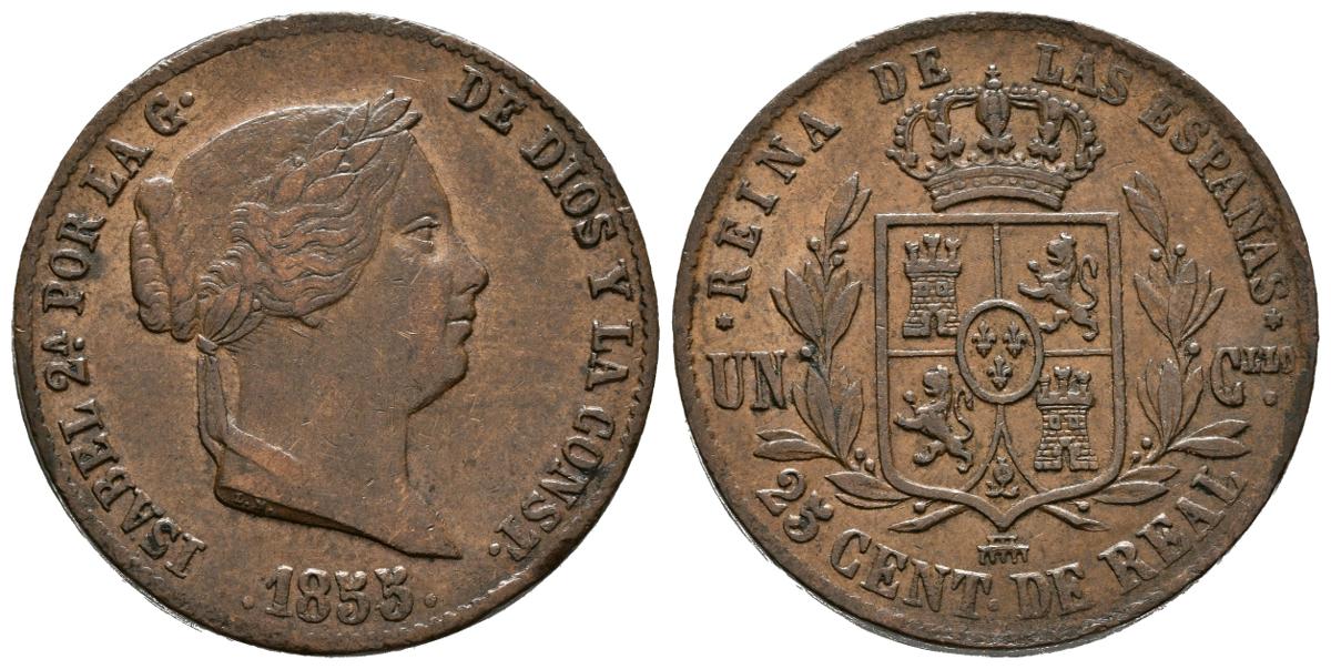 ISABEL II (1833-1868). 25 Céntimos de Real. (Cu. 9,80g/27mm). 1855. Segovia. (Cal-2019-188). MBC+.