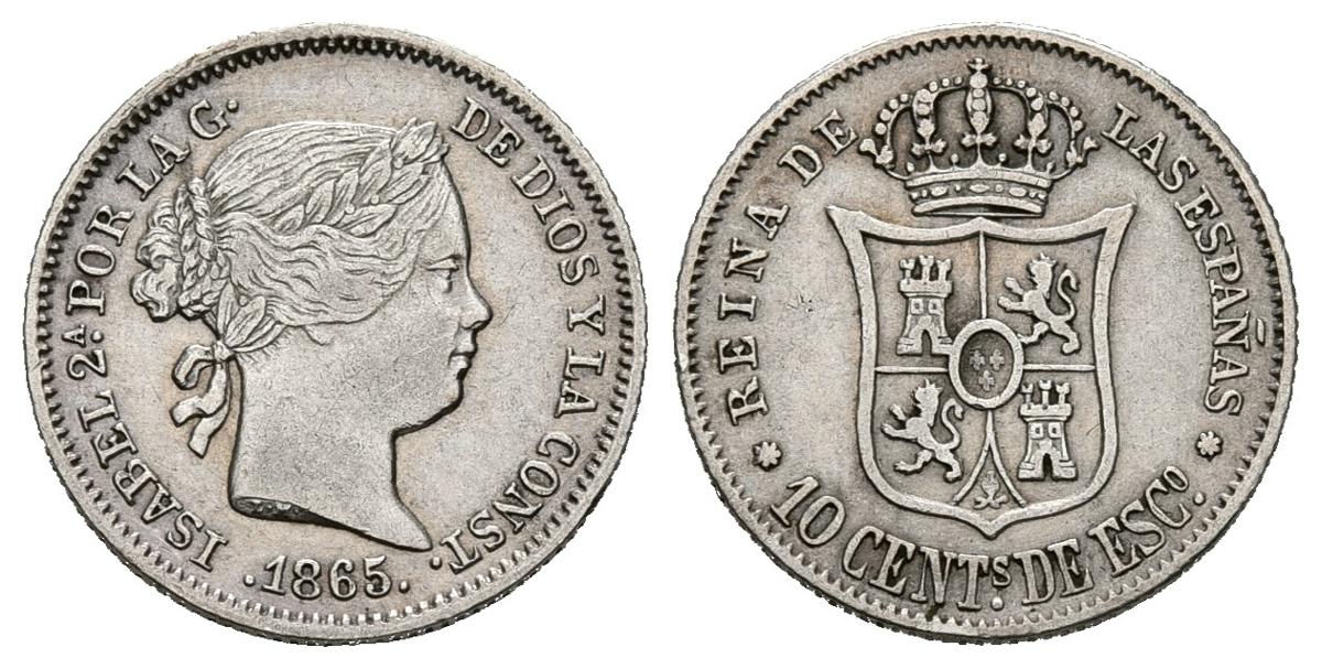ISABEL II (1833-1868). 10 Céntimos de Escudo (Ar.1,30g/13,2mm). 1865. Sevilla. (Cal-2019-342). MBC. Golpecitos en canto