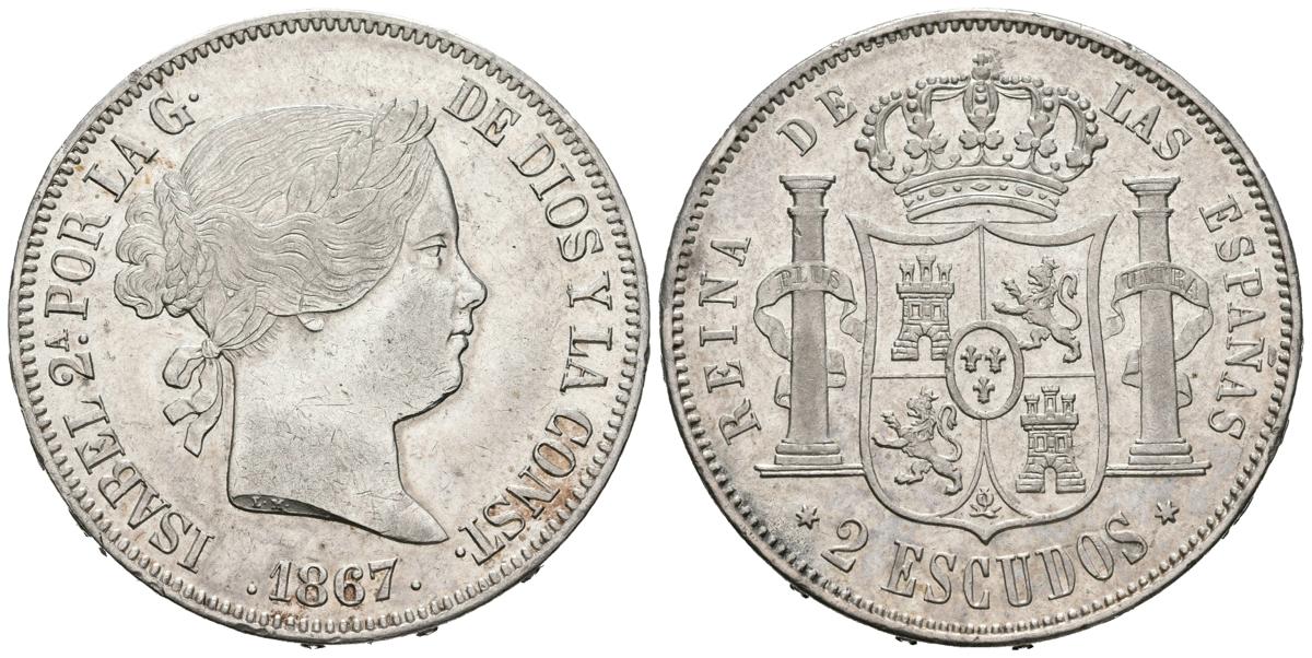 ISABEL II (1833-1868). 2 Escudos. (Ar. 25,80g/37mm). 1867. Madrid. (Cal-2019-647). EBC. Golpecito en canto.