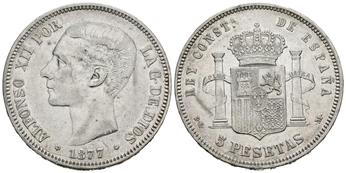ALFONSO XII (1874-1885). 5 Pesetas. (Ar. 24,90g/37mm). 1877 *18-77. Madrid DEM. (Cal-2019-38). MBC.