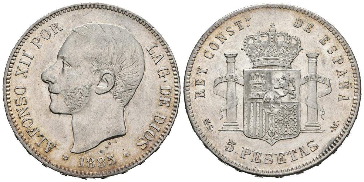 ALFONSO XII (1874-1885). 5 Pesetas. (Ar. 24,94g/36mm). 1885 *18-87. Madrid MSM. (Cal-2019-62). EBC.